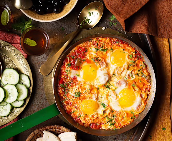 A warm, savory dish made with scrambled eggs, tomatoes, peppers, and olive oil, sometimes with cheese or sucuk. Light, juicy, and perfect with crusty bread.